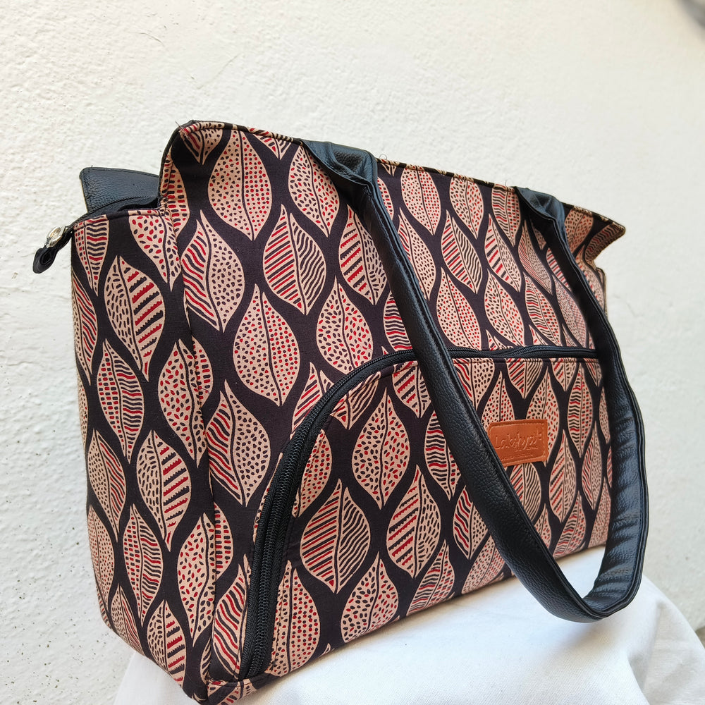 Versatile partition tote black with red leaf print