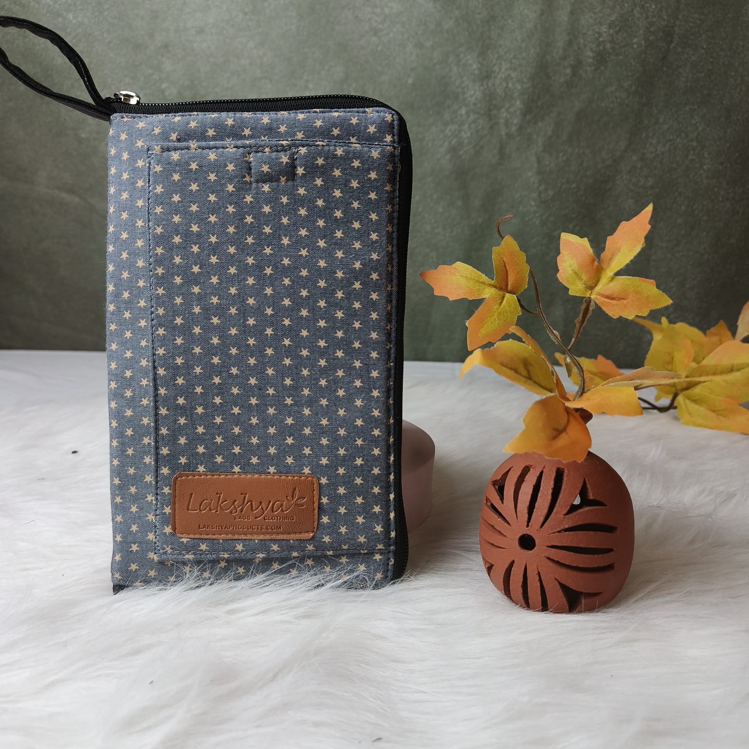 Utility wallets are highly functional purses for any women. Size : L-5.5 W-9 H-1 inches It has 8 card holders, one mobile holder, a sunglass/specs partition and cash or coin division for convenience. Made out of pure cotton with foam padding and drill lining and has a handle made of vegan leather. Mobile partition has a velcro closing to secure