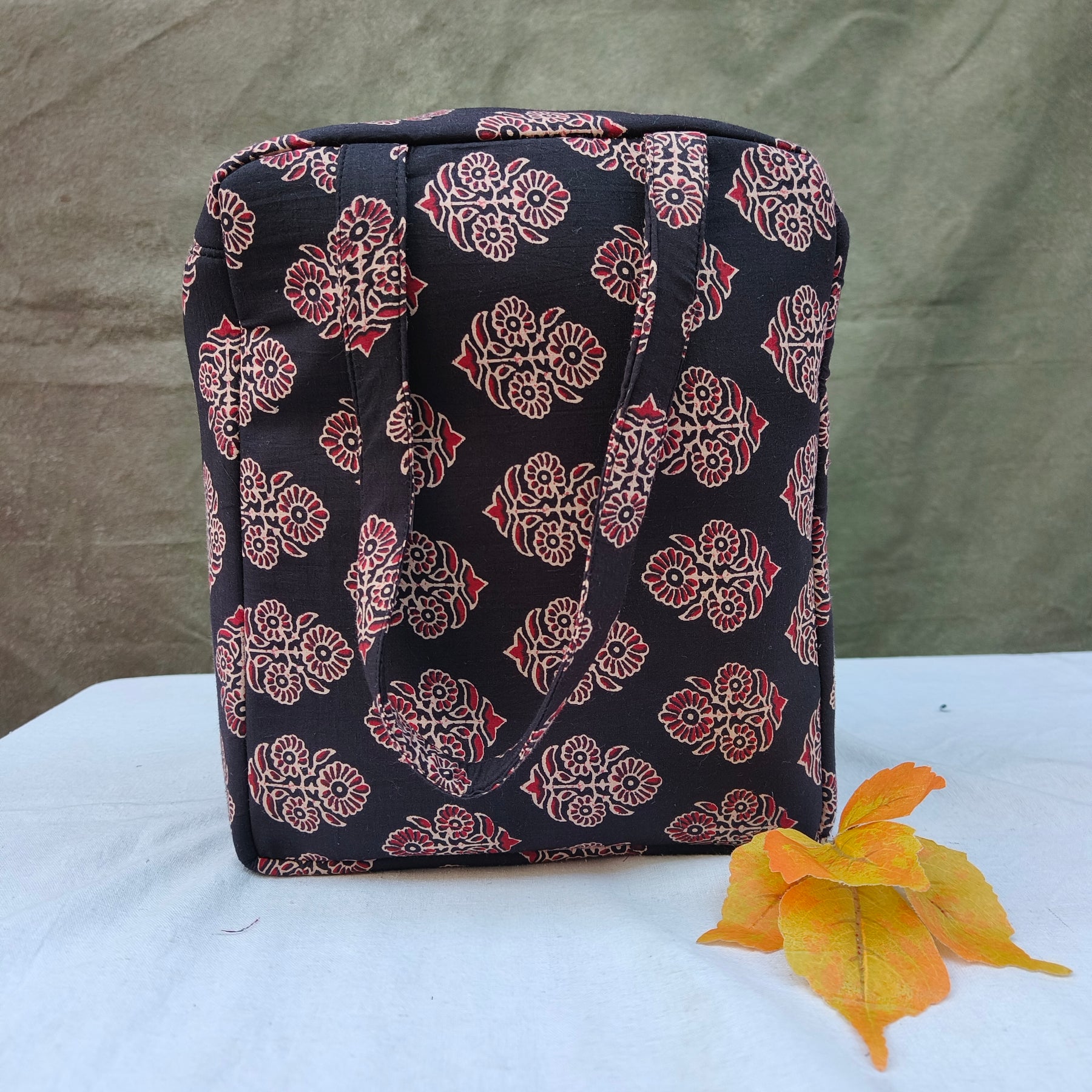 Water Proof Cotton Lunch Bag Black With Flower Print