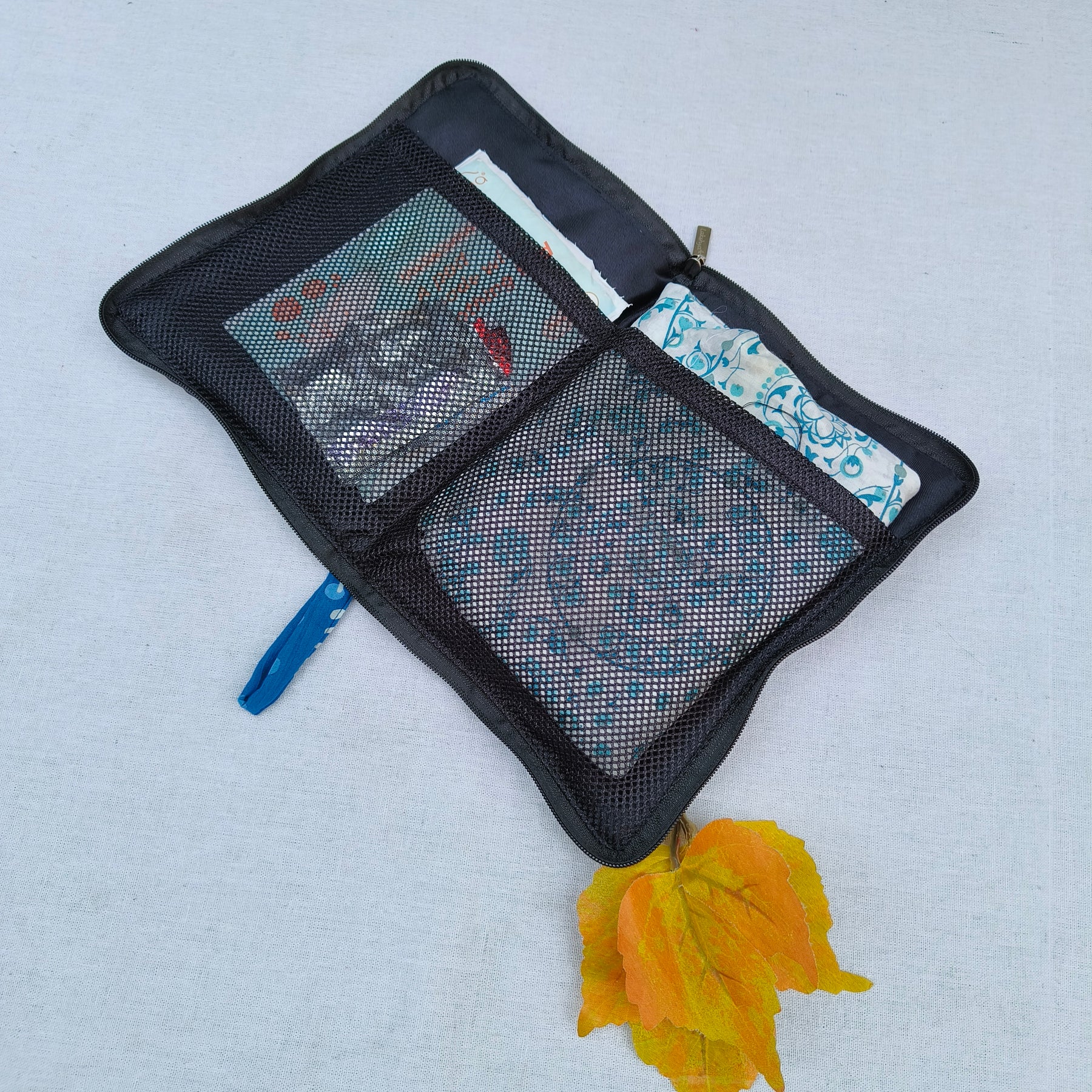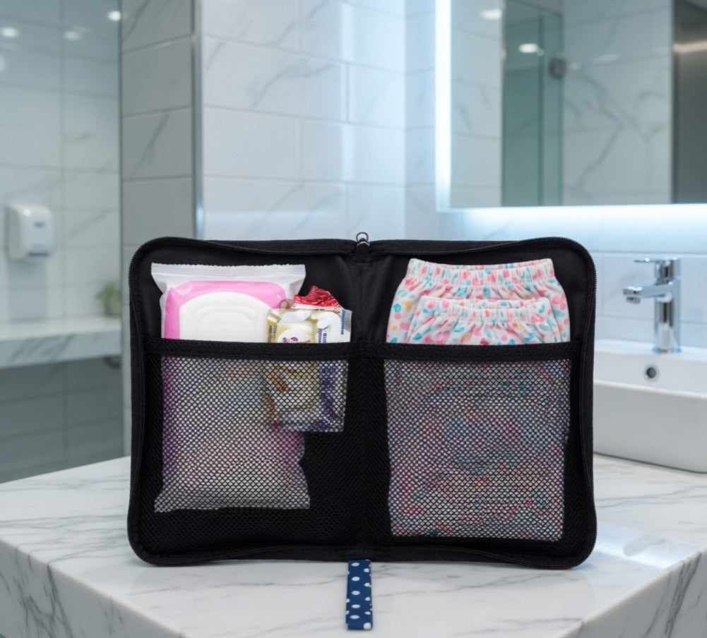 Made Specifically for School goers, College goers and Office goers this pouch can accomodate Sanitary Pad (Even Night Pads which longer can be accomodated), Medicines, Extra Pair Of underpants . This pouch is fully washable made of cotton with foam padding and drill lining.