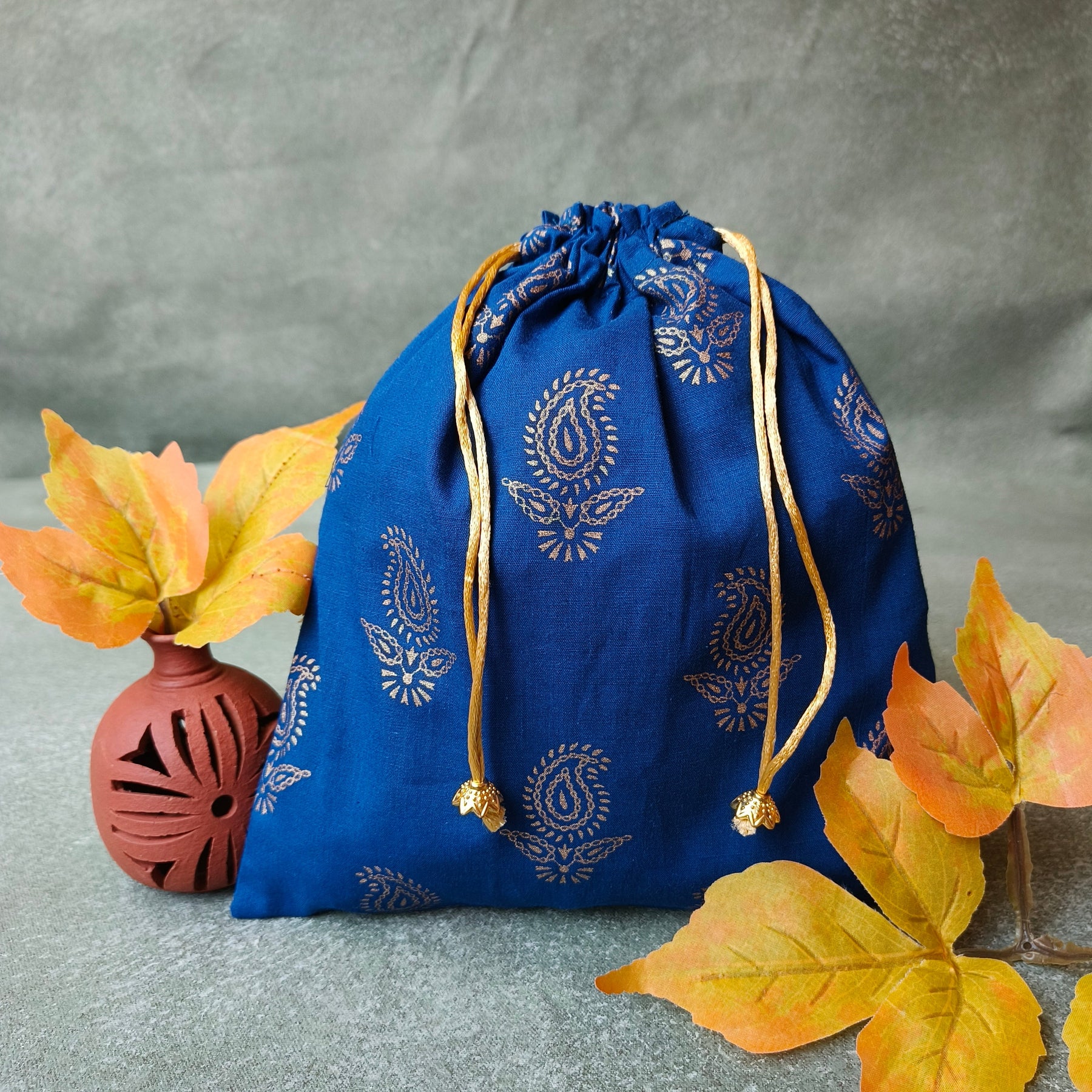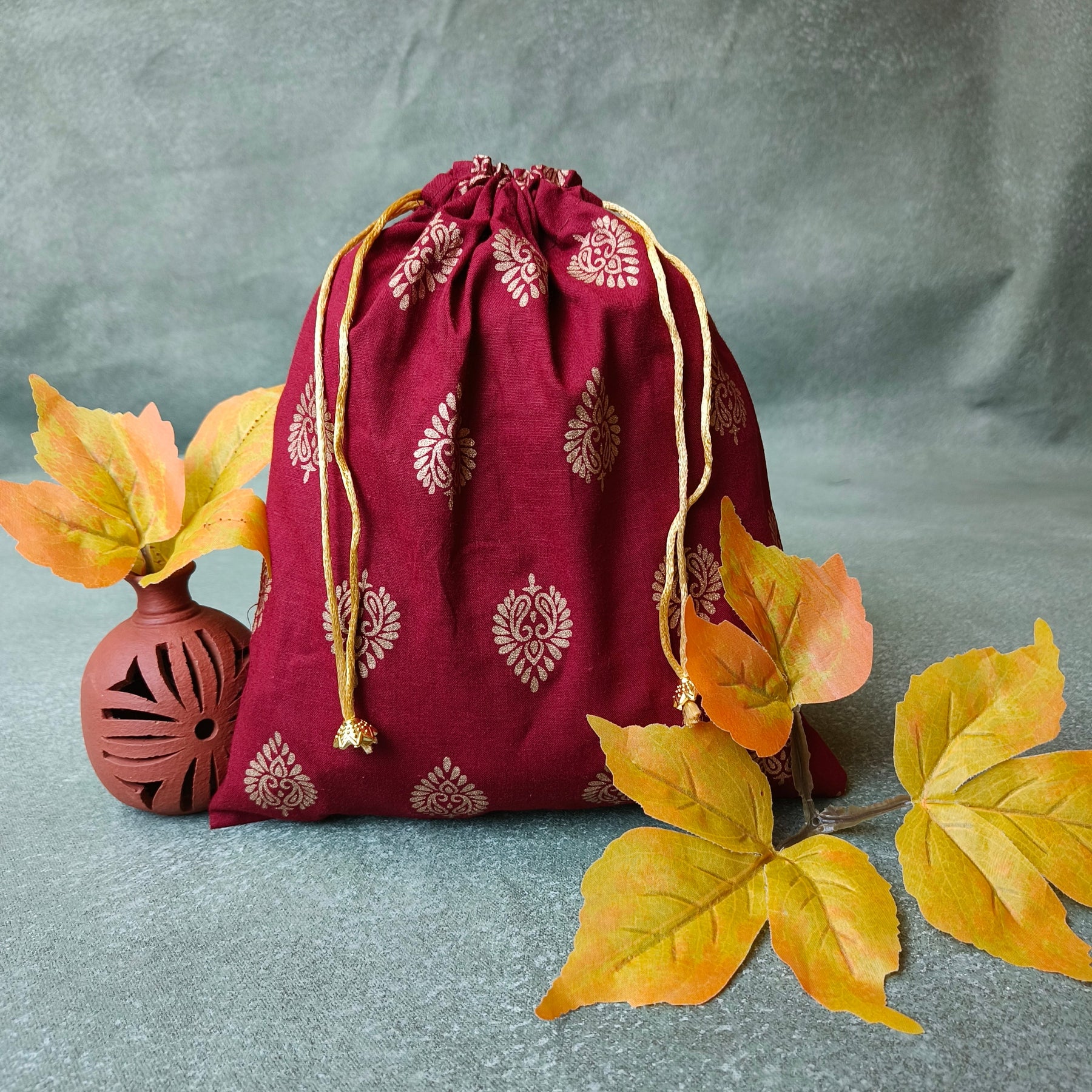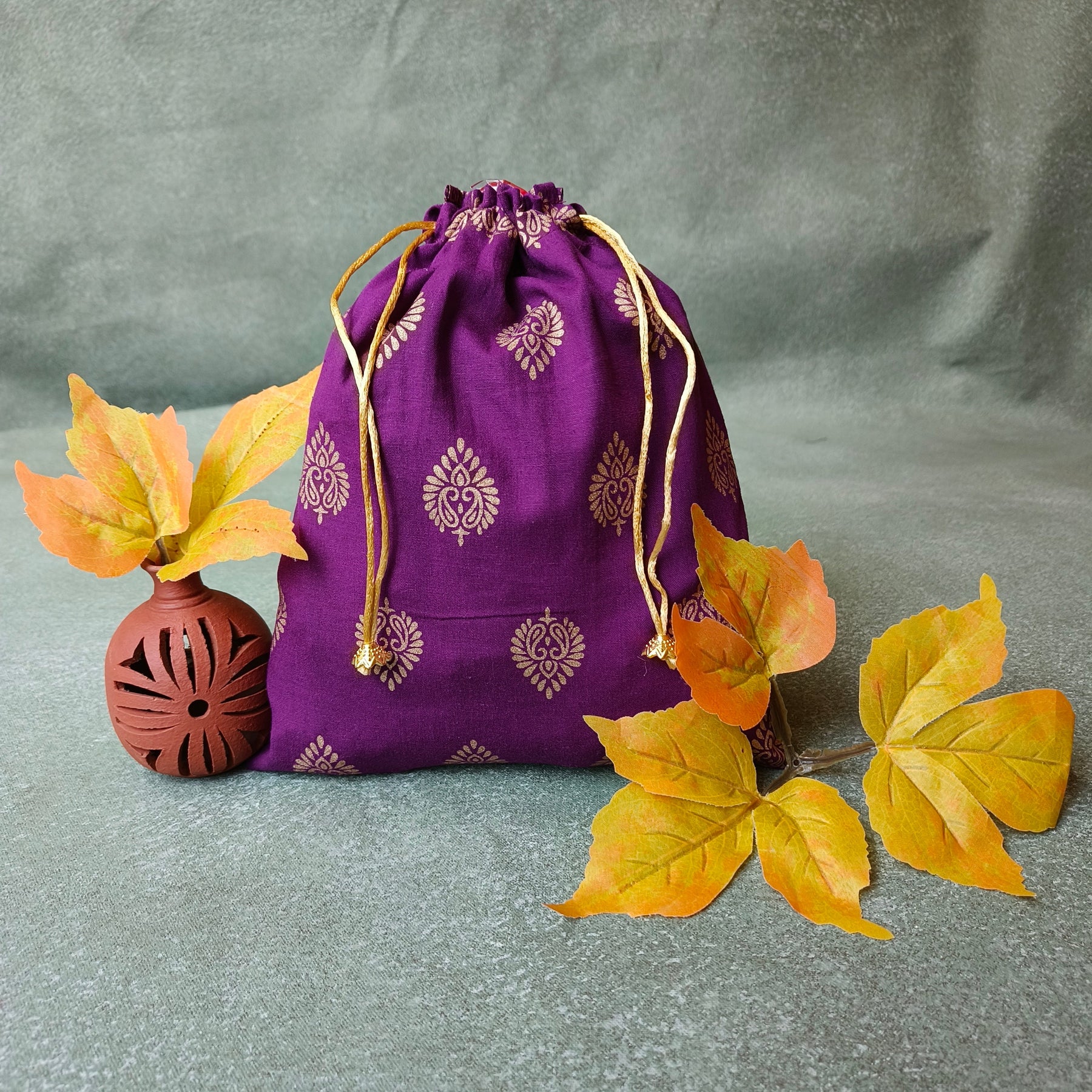 Most elegant and sophisticated potlis with gold thread . Available in different colors.